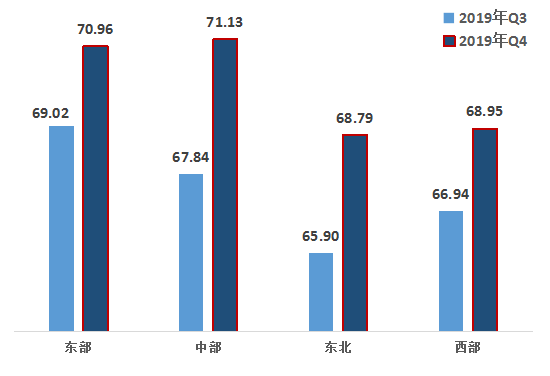 從區(qū)域來(lái)看,中部地區(qū)改革熱度崛起,東北地區(qū)與其他地區(qū)的差距呈縮小狀態(tài)。第四季度,東部、中部、東北、西部的改革熱度指數(shù)分別為70.96,71.13,68.79,68.95,比上一季度均有上升。其中,中部、東北地區(qū)的升幅較大。