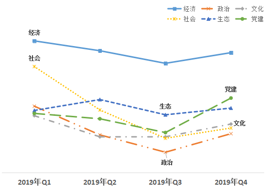 從領(lǐng)域來(lái)看,文化、政治領(lǐng)域改革熱度值偏低,黨建領(lǐng)域提升最多。第四季度,經(jīng)濟(jì)領(lǐng)域得分78.41,政治領(lǐng)域得分65.95,文化領(lǐng)域得分67.43,社會(huì)領(lǐng)域得分66.82,生態(tài)領(lǐng)域得分69.89,黨建領(lǐng)域得分71.43。