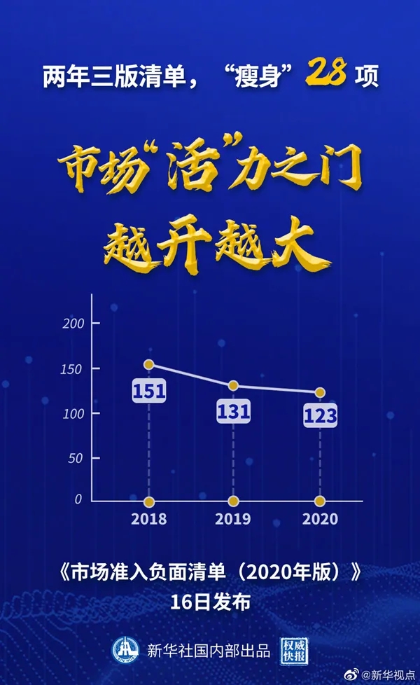 國家發(fā)展改革委、商務(wù)部16日公布《市場準入負面清單(2020年版)》。新版清單直接放開“森林資源資產(chǎn)評估項目核準”等措施,刪除“證券公司董事、監(jiān)事、高級管理人員任職資格核準”等措施,清單事項縮減至123項,比2019年版清單再減8項。(記者安蓓 海報設(shè)計:張惠慧 張晨光)