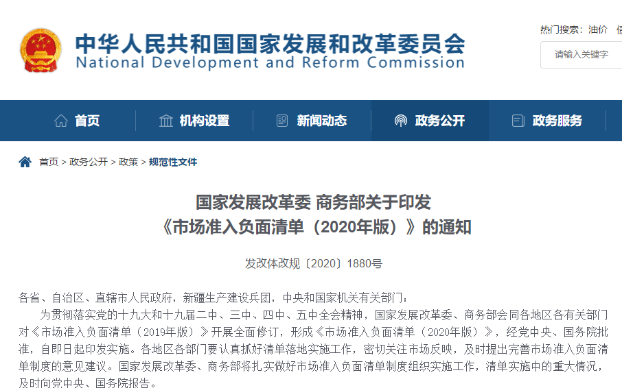 國家發(fā)展改革委新聞發(fā)言人孟瑋表示,從2018年12月正式發(fā)布全國統(tǒng)一的市場準入負面清單以來,通過三年落地實施,已經(jīng)實現(xiàn)了在全國范圍確立了市場準入環(huán)節(jié)的負面清單管理模式。清單之外的行業(yè)、領(lǐng)域、業(yè)務(wù)等,市場主體可以依法平等進入,實現(xiàn)“非禁即入”。