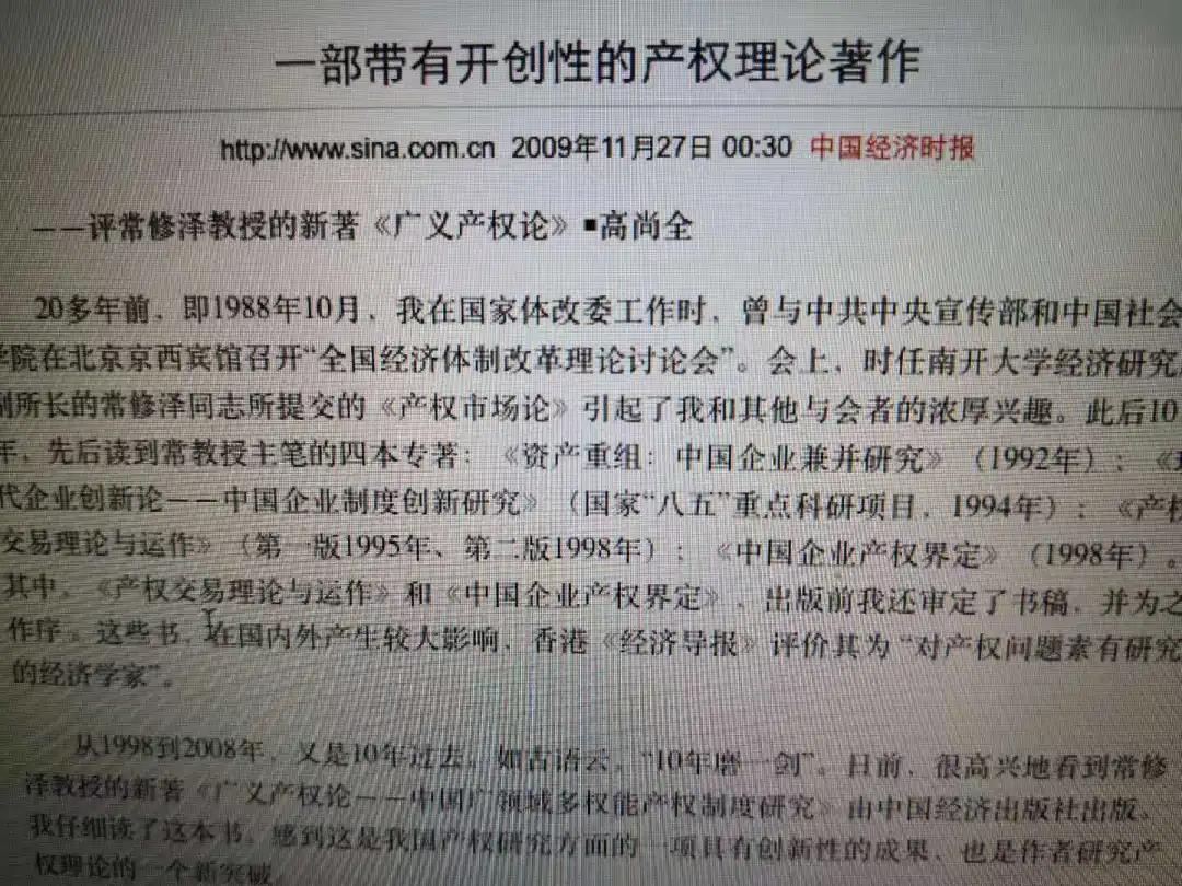 出版后,有肯定,也有非議:如說天地人產(chǎn)權(quán)是“異想天開”,產(chǎn)權(quán)三要義(廣領(lǐng)域、多權(quán)能、四聯(lián)動)“過于寬泛”等等(這很正常的)。在此之際,您也參與討論,公開發(fā)表文章,支持“從世界和中國大局研究產(chǎn)權(quán)問題”;肯定“廣義產(chǎn)權(quán)理論”,認(rèn)為“對國家發(fā)展有應(yīng)用價值”等(見高尚全:《一部帶有開創(chuàng)性的產(chǎn)權(quán)理論著作》,《中國經(jīng)濟時報》2010年11月27日)。今天,再憶這段往事,再讀您的文章,既感謝您2003年的指點,也感激您2010年的支持。