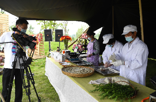 圖為近日安徽省肥西縣柿樹崗鄉(xiāng)村民通過“云上”直播制作當?shù)靥厣朗场P氯A社記者 劉軍喜 攝