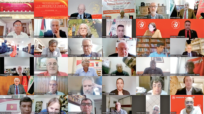 2022年7月28日,中國(guó)共產(chǎn)黨與世界馬克思主義政黨論壇舉行。習(xí)近平總書記在賀信中強(qiáng)調(diào),中國(guó)共產(chǎn)黨愿同各國(guó)馬克思主義政黨加強(qiáng)交流對(duì)話,立足本國(guó)國(guó)情,把準(zhǔn)時(shí)代脈搏,不斷豐富和發(fā)展馬克思主義,在攜手推動(dòng)構(gòu)建人類命運(yùn)共同體的進(jìn)程中讓馬克思主義展現(xiàn)出更強(qiáng)大的真理力量。圖為外國(guó)政黨代表線上參加論壇。 中共中央對(duì)外聯(lián)絡(luò)部供圖
