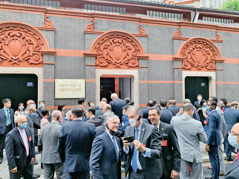 2021年6月16日,“中國(guó)共產(chǎn)黨的故事——習(xí)近平新時(shí)代中國(guó)特色社會(huì)主義思想在上海的實(shí)踐”特別對(duì)話會(huì)在上海舉行。近100個(gè)國(guó)家、126個(gè)政黨和友好組織的740多名代表通過視頻連線參加對(duì)話會(huì),40多個(gè)國(guó)家駐華大使現(xiàn)場(chǎng)出席會(huì)議。圖為與會(huì)駐華使節(jié)參觀中共一大會(huì)址。 人民網(wǎng) 馬作鵬/攝