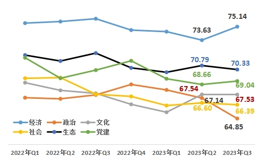 從改革熱度指數(shù)的六大領(lǐng)域來看,經(jīng)濟領(lǐng)域75.14,政治領(lǐng)域64.85,文化領(lǐng)域67.53,社會領(lǐng)域66.39,生態(tài)領(lǐng)域70.33,黨建領(lǐng)域69.04。與上一季度相比,經(jīng)濟、黨建領(lǐng)域上升。