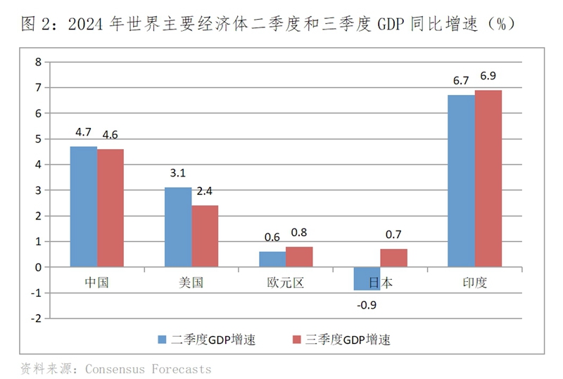 Consensus Forecasts 9月份最新預(yù)測,世界主要經(jīng)濟(jì)體GDP增速有升有落,呈現(xiàn)出走勢分化的特征。三季度美國GDP同比增長2.4%,比二季度增長3.1%回落0.7個百分點;歐元區(qū)增長0.8%,比二季度增長0.6%回升0.2個百分點;日本增長0.7%,二季度下降0.9%,增速由負(fù)轉(zhuǎn)正;印度增長6.9%,比二季度增長6.7%回升0.2個百分點。