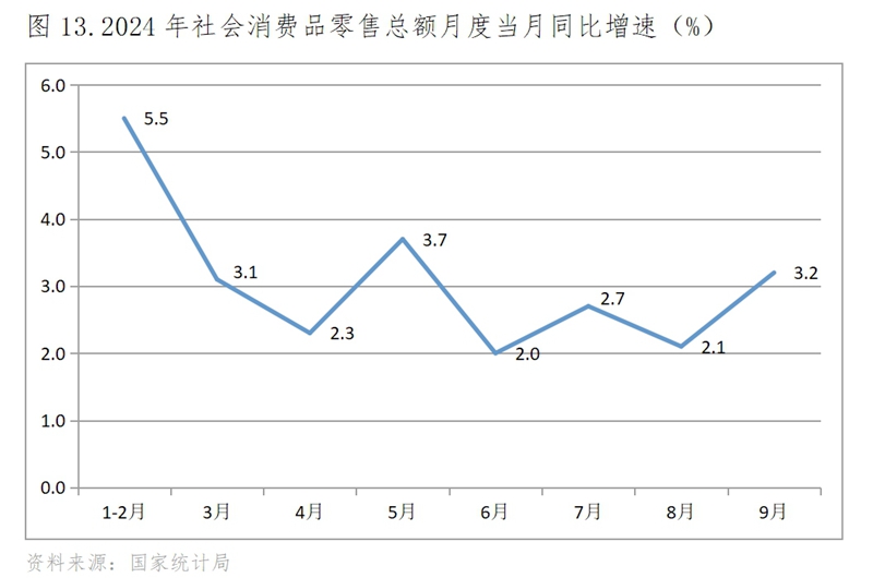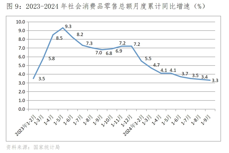 (三)零售增速總體呈現(xiàn)低速波動回落,9月份回升。1-2月份社會消費品零售總額同比增長5.5%,為今年以來的最快增速,3月份回落到增長3.1%,此后增速在2.0-4.0%區(qū)間內(nèi)低速波動,9月份增速回升,增長3.2%。