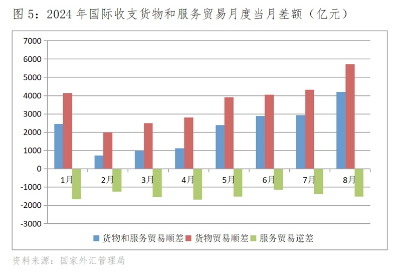 (四)國際收支貨物和服務(wù)貿(mào)易順差總體逐月增加,貨物貿(mào)易順差的增加是主因。1月份,國際收支貨物和服務(wù)貿(mào)易順差實現(xiàn)了高開,達(dá)到了2459億元,2月份回落到724億元,但從2月份開始國際收支貨物和服務(wù)貿(mào)易順差逐月增加, 8月份達(dá)4203億元,比2月份增加了3479億元。
