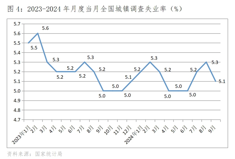 (三)調(diào)查失業(yè)率比上年同期略升,比6月份也略升。9月份城鎮(zhèn)調(diào)查失業(yè)率為5.1%,比上年同期的5.0%回升了0.1個百分點,比6月份的5.0%也回升了0.1個百分點。從結(jié)構(gòu)上看,青年調(diào)查失業(yè)率還保持在較高水平,8月份全國城鎮(zhèn)不包含在校生的16-24歲的調(diào)查失業(yè)率為18.8%,比上年12月份的14.9%回升3.9個百分點,就業(yè)壓力仍還比較大。