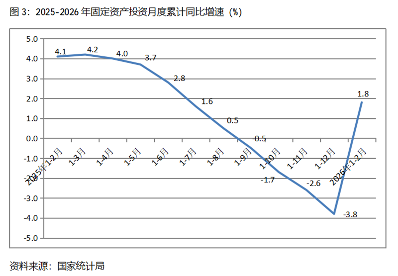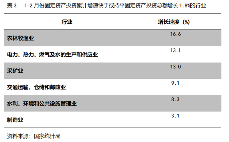 1-2月份,固定資產(chǎn)投資累計(jì)增速快于或持平固定資產(chǎn)投資總額增長(zhǎng)1.8%的行業(yè)共6個(gè),即農(nóng)林牧漁業(yè)增長(zhǎng)16.6%,電力、熱力、燃?xì)饧八纳a(chǎn)和供應(yīng)業(yè)增長(zhǎng)13.1%,采礦業(yè)增長(zhǎng)13.0%,交通運(yùn)輸、倉儲(chǔ)和郵政業(yè)增長(zhǎng)9.1%,水利、環(huán)境和公共設(shè)施管理業(yè)增長(zhǎng)8.3%,制造業(yè)增長(zhǎng)3.1%。