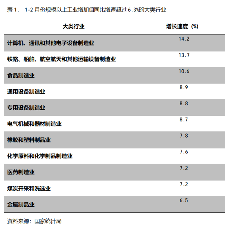 1-2月份,增長(zhǎng)速度超過或持平規(guī)模以上工業(yè)增長(zhǎng)6.3%的主要大類行業(yè)共有11個(gè),即計(jì)算機(jī)、通訊和其他電子設(shè)備制造業(yè)增長(zhǎng)14.2%,鐵路、船舶、航空航天和其他運(yùn)輸設(shè)備制造業(yè)增長(zhǎng)13.7%,食品制造業(yè)增長(zhǎng)10.6%,通用設(shè)備制造業(yè)增長(zhǎng)8.9%,專用設(shè)備制造業(yè)增長(zhǎng)8.8%,電氣機(jī)械和器材制造業(yè)增長(zhǎng)8.7%,橡膠和塑料制品業(yè)增長(zhǎng)7.8%,化學(xué)原料和化學(xué)制品制造業(yè)增長(zhǎng)7.6%,醫(yī)藥制造業(yè)增長(zhǎng)7.2%,煤炭開采和洗選業(yè)增長(zhǎng)7.2%,金屬制品業(yè)增長(zhǎng)6.5%。