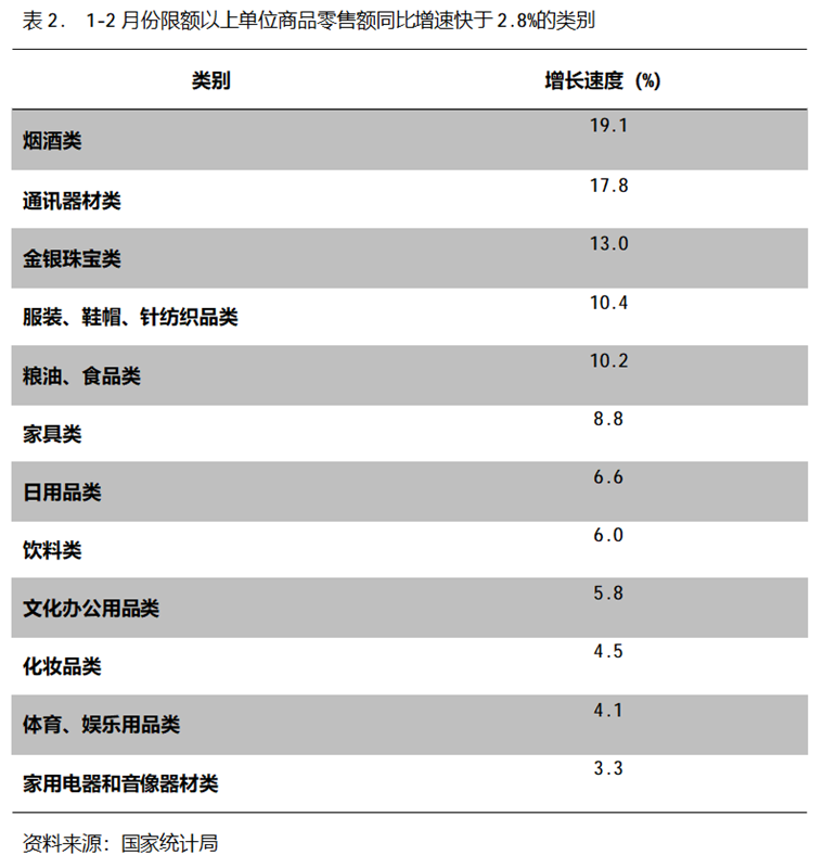 1-2月份,限額以上單位商品零售額同比增速快于社會(huì)消費(fèi)品零售總額2.8%增速的共有12類,即煙酒類增長(zhǎng)19.1%,通訊器材類增長(zhǎng)17.8%,金銀珠寶類增長(zhǎng)13.0%,服裝、鞋帽、針紡織品類增長(zhǎng)10.4%,糧油、食品類增長(zhǎng)10.2%,家具類增長(zhǎng)8.8%,日用品類增長(zhǎng)6.6%,飲料類增長(zhǎng)6.0%,文化辦公用品類增長(zhǎng)5.8%,化妝品類增長(zhǎng)4.5%,體育、娛樂類增長(zhǎng)4.1%,家用電器和音像類增長(zhǎng)3.3%。