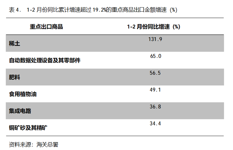 1-2月份,出口金額同比增速超過19.2%的重點(diǎn)商品共有6類,即稀土出口同比增長(zhǎng)131.9%,自動(dòng)數(shù)據(jù)處理設(shè)備及其零部件增長(zhǎng)65.0%,肥料出口增長(zhǎng)56.5%,食用植物油增長(zhǎng)49.1%,集成電路增長(zhǎng)36.8%,銅礦砂及其精礦增長(zhǎng)34.4%。