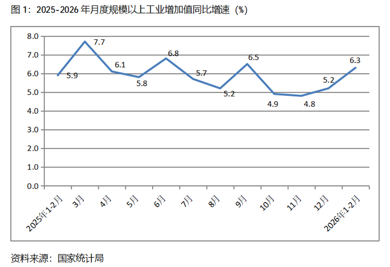 一、工業(yè)增速持續(xù)回升。1-2月份,規(guī)模以上工業(yè)增加值同比增長(zhǎng)6.3%,比上年12月份增長(zhǎng)5.2%回升了1.1個(gè)百分點(diǎn),上年12月份比上年11月份增長(zhǎng)4.8%回升了0.4個(gè)百分點(diǎn)。從工業(yè)三大門類看,采礦業(yè)、制造業(yè)和電力、熱力、燃?xì)饧八a(chǎn)和供應(yīng)業(yè)增速比上年12月份全面回升,1-2月份,采礦業(yè)同比增長(zhǎng)6.1%,比上年12月份增長(zhǎng)5.6%回升0.5個(gè)百分點(diǎn);制造業(yè)增長(zhǎng)6.6%,比上年12月份增長(zhǎng)6.4%回升0.2個(gè)百分點(diǎn);電力、熱力、燃?xì)饧八a(chǎn)和供應(yīng)業(yè)增長(zhǎng)4.7%,比上年12月份增長(zhǎng)2.3回升2.4個(gè)百分點(diǎn)。