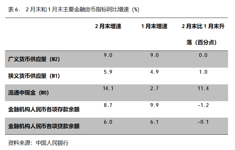 六、M2增速由升轉(zhuǎn)平。2月末,廣義貨幣供應(yīng)量(M2)同比增長(zhǎng)9.0%,與1月份末增長(zhǎng)9.0%持平,1月末增幅比上年末增長(zhǎng)8.5%回升0.5個(gè)百分點(diǎn);狹義貨幣供應(yīng)量(M1)同比增長(zhǎng)5.9%,比1月末增長(zhǎng)4.9%回升1.0個(gè)百分點(diǎn),1月末增幅比上年末增長(zhǎng)3.8%回升1.1個(gè)百分點(diǎn);流通中貨幣(M0)同比增長(zhǎng)14.1%,比1月末增長(zhǎng)2.7%回升11.4個(gè)百分點(diǎn),1月末增幅比上年末增長(zhǎng)10.2%回落7.5個(gè)百分點(diǎn)。2月末,雖然M2增速與M1增速差距進(jìn)一步縮小,但仍還保持著不小的差距。