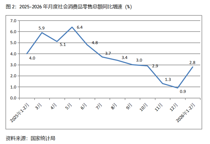 二、零售增速由落轉(zhuǎn)升。1-2月份,社會(huì)消費(fèi)品零售總額同比增長(zhǎng)2.8%,比上年12月份增長(zhǎng)0.9%回升了1.9個(gè)百分點(diǎn),上年12月份比上年11月份增長(zhǎng)1.3%回落了0.4個(gè)百分點(diǎn),其中,餐飲收入和商品零售額增速均出現(xiàn)了回升,1-2月份餐飲收入同比增長(zhǎng)4.8%,比上年12月份增長(zhǎng)2.2%回升了2.6個(gè)百分點(diǎn);商品零售額增長(zhǎng)2.5%,比上年12月份增長(zhǎng)0.7%回升1.8個(gè)百分點(diǎn)。連續(xù)幾個(gè)月增速回落的社會(huì)消費(fèi)品零售總額增速出現(xiàn)了積極回升的苗頭。