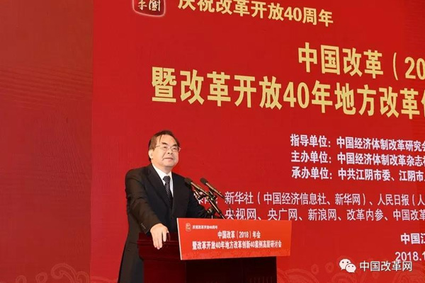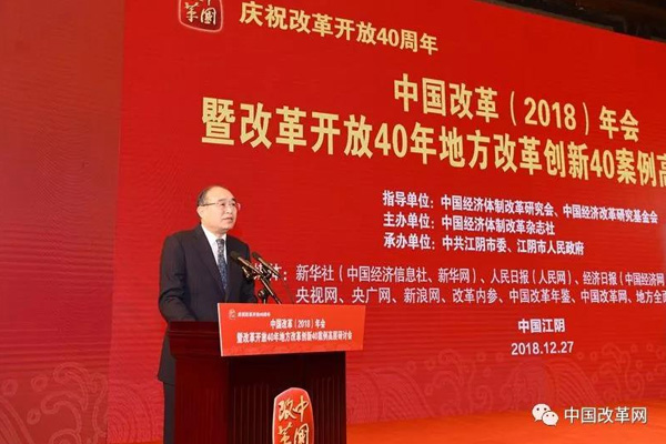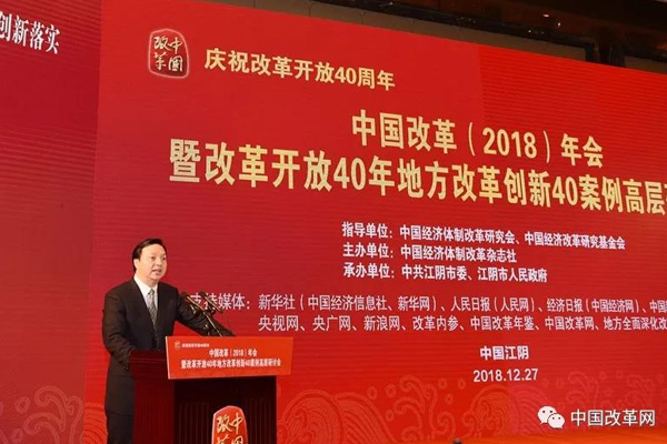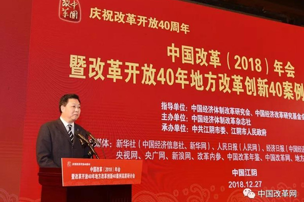 2018年12月27日,由中國經(jīng)濟體制改革研究會、中國經(jīng)濟改革研究基金會指導,中國經(jīng)濟體制改革雜志社主辦,中共江陰市委、江陰市人民政府承辦的“慶祝改革開放40周年——中國改革(2018)年會暨改革開放40年地方改革創(chuàng)新40案例高層研討會”在江蘇省江陰市召開。